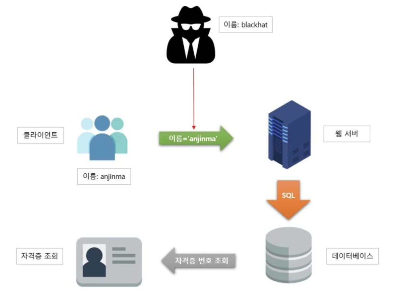 자격증 번호를 조회할수 있는 시스템이 있다고하자 기본적인 sql진행은 클라이언트가 무엇인가를 '클릭' 하게되고 그것이 서버로 서버에선 db로 요청이 가게된다. db에선 값을 확인하후 존재한다면 출력 여기서 이름이 blackhat이라는 클라이언트가 자신의 blackhat을 조회해야 하는데 sql 구문을 변경하여 anjinma라는 클라이언트의 자격증 번호를 조회한다.