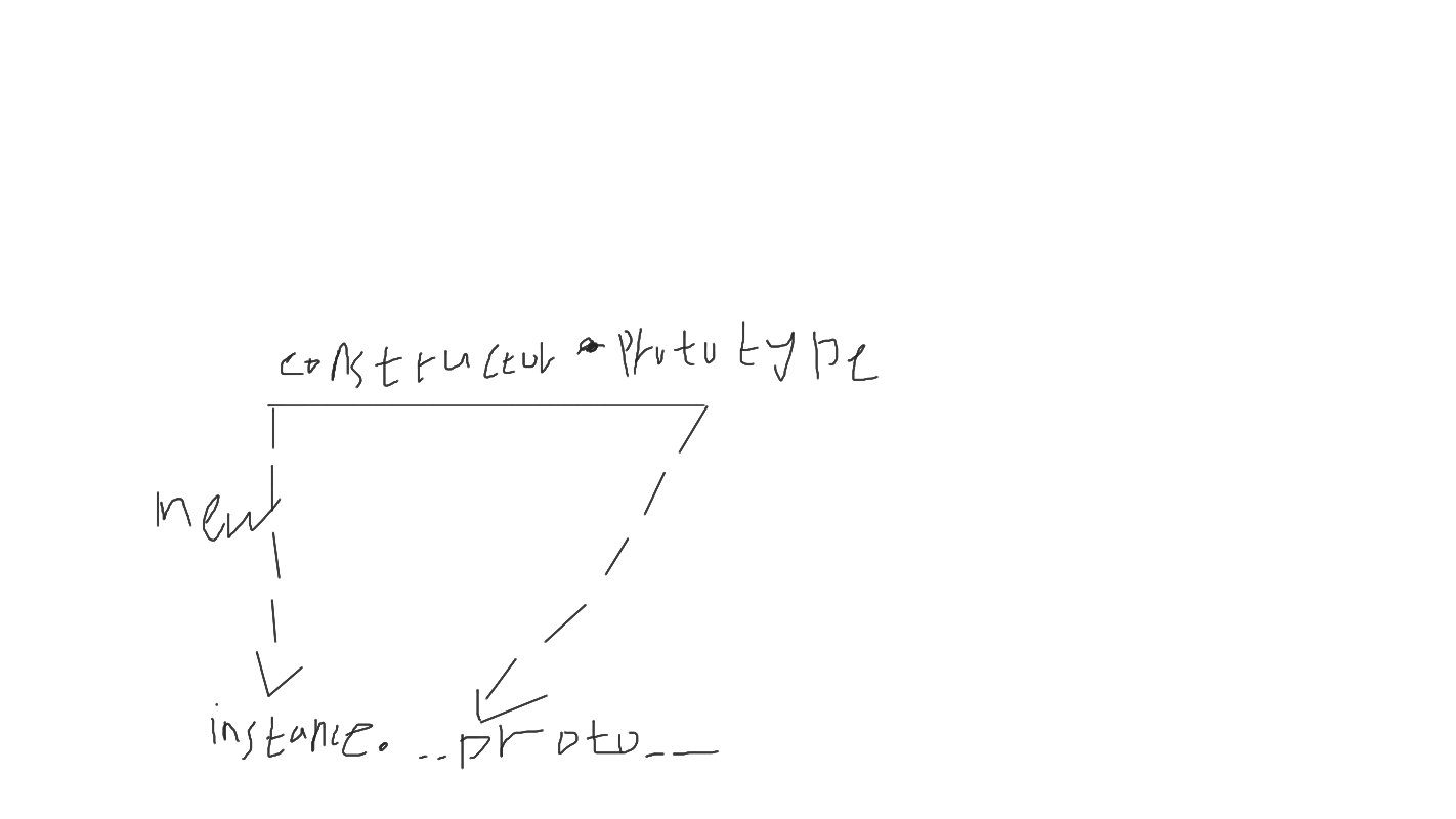 그러니까 윗변엔 Contructor(생성자 함수)를 오른쪽 꼭짓점엔 Constructore.prototype 이라는 프로퍼티 왼쪽 꼭짓점 아래 화살표 중간엔 new 그 끝엔 instance가 존재 다시 오른쪽 꼭짓점 에서 내려오는 화살표 끝에는 instance.__proto__프로퍼티가 존재 한다.