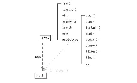 Array를 new연산자와 함께 arr = new Array(1,2) 해서 인스턴스를 생성하든, 그냥 배열 리터럴을 하든 insatnce인 [1,2] 가 만들어진다. 앞서 __proto__는 constructor.prototype을 참조한다고 하였으니 위 에선 Array.prototype을 참조 할것이다. __proto__가 생략 가능하므로 push, pop등의 메서드를 자신의 것처럼 호출 할 수 있다.