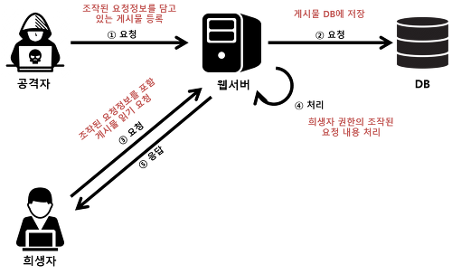 공격자가 악성 스크립트를 서버에 영구적으로 저장해 두고, 다른 사용자가 해당 콘텐츠를 요청할 때마다 스크립트가 실행되는 형태입니다. 예를 들어, 게시판에 글을 올리거나, 프로필 정보를 업데이트할 때 악성 스크립트를 포함시키는 방식입니다.