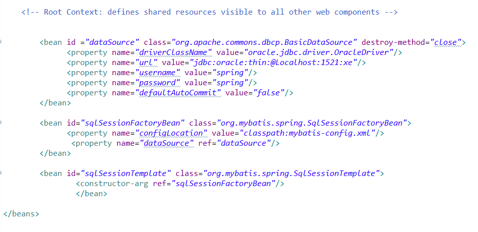 드라이버 연결/ Spring과 Mybatis를 연결하고 DB와 상호작용 하는 sqlSessionFactoryBean /싱글톤으로 관리되며 여러 부분에서 공유할 수 있는 sqlSessionTemplate)