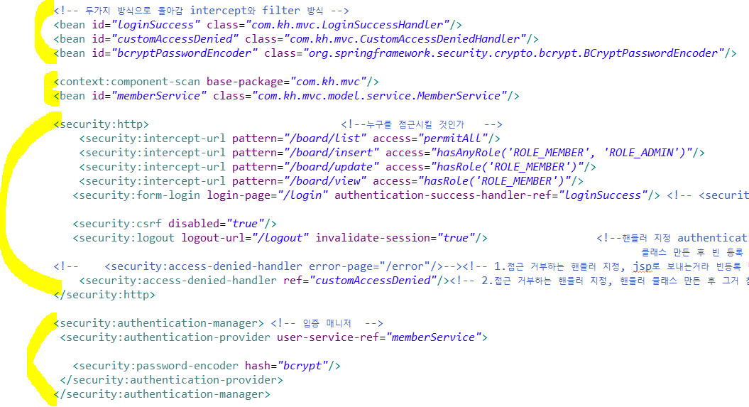<security:access-denied-handler> : 만약 사용자권한으로 로그인이 되어 잇는 경우 관리자 페이지로 접근했을 때 접근 거부하는 설정하는 핸들러
