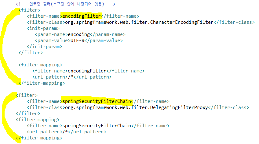 encodingFilter(한글 처리) 와 sprinfSecurityFilterChain(보안설정 관리) 등록