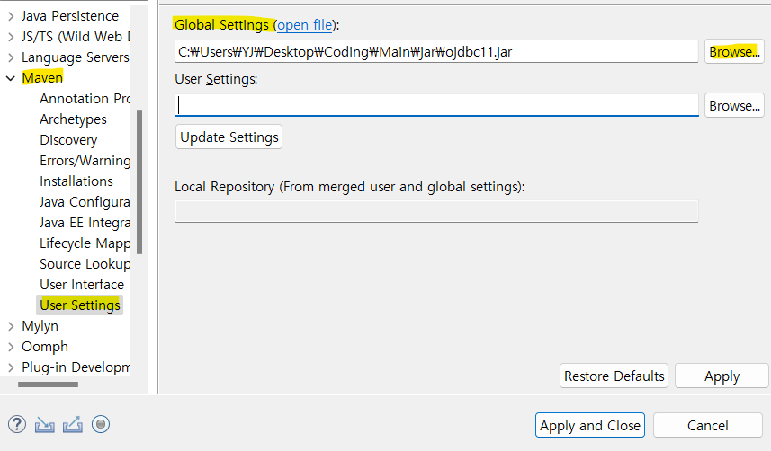 2.Maven-User Settings 에서 Global Settings의 Browse를 선택해 ojdbc.jar를 추가한다.