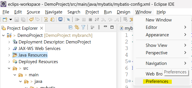 - 이클립스 메뉴 window-Preferences