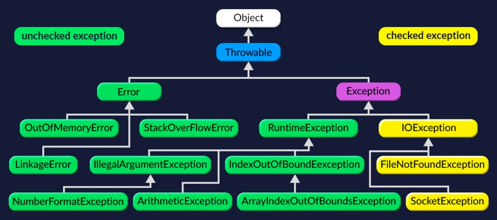 RuntimeException을 상속하지 않는 클래스RuntimeException을 상속하는 클래스위의 사진을 보면 Object 클래스 아래에 Throwable 클래스가 있고 Error과 Exception 클래스로 나뉜다. 노란색으로 표시된 것들이 Checked이고 초록색은 Unchecked이다.
