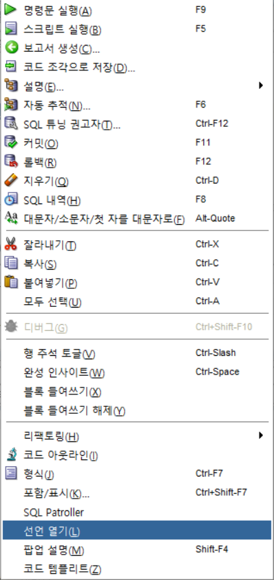 SQL Developer 접속 후 원하는 테이블 선택 -> 마우스 오른쪽 클릭 -> 선언 열기(또는 팝업 설명) 누르면 칼럼의 이름, 타입, comments등이 나온다. comments가 칼럼 의미