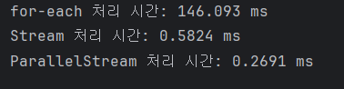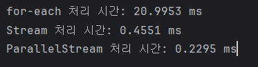 System.out.println("ParallelStream 처리 시간: " + elapsedTimeParallelStream + " ms");