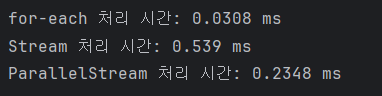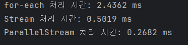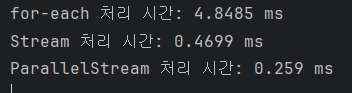 System.out.println("Stream 처리 시간: " + elapsedTimeStream + " ms");