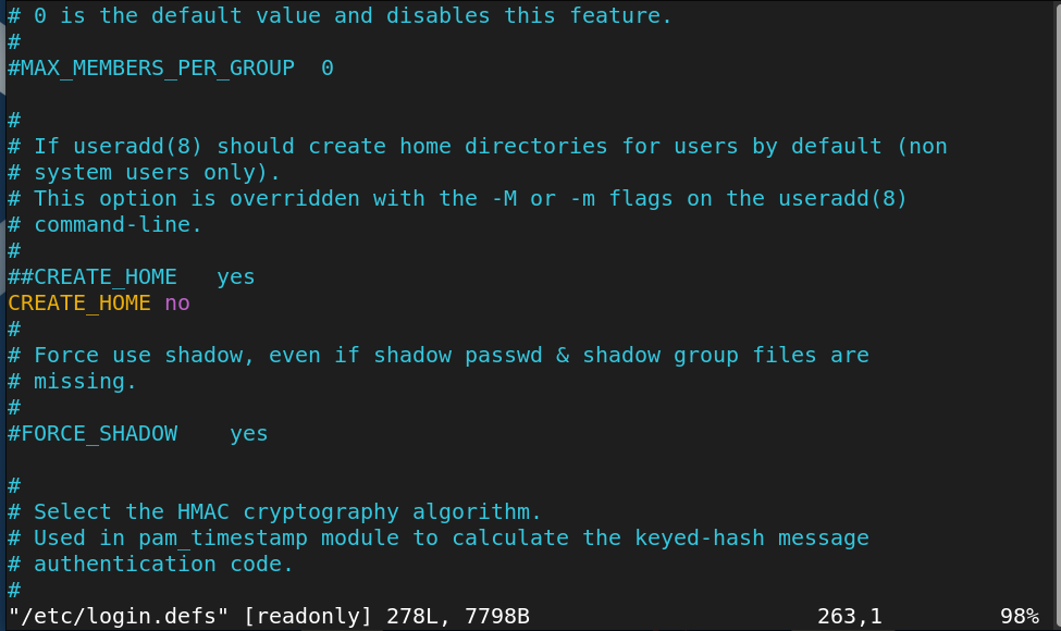 $vim /etc/logins.defs 에서 CREATE_HOME 옵션을 no로 설정하면