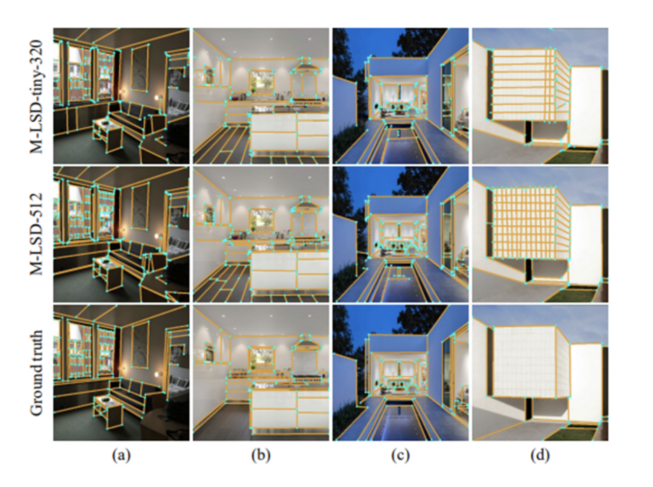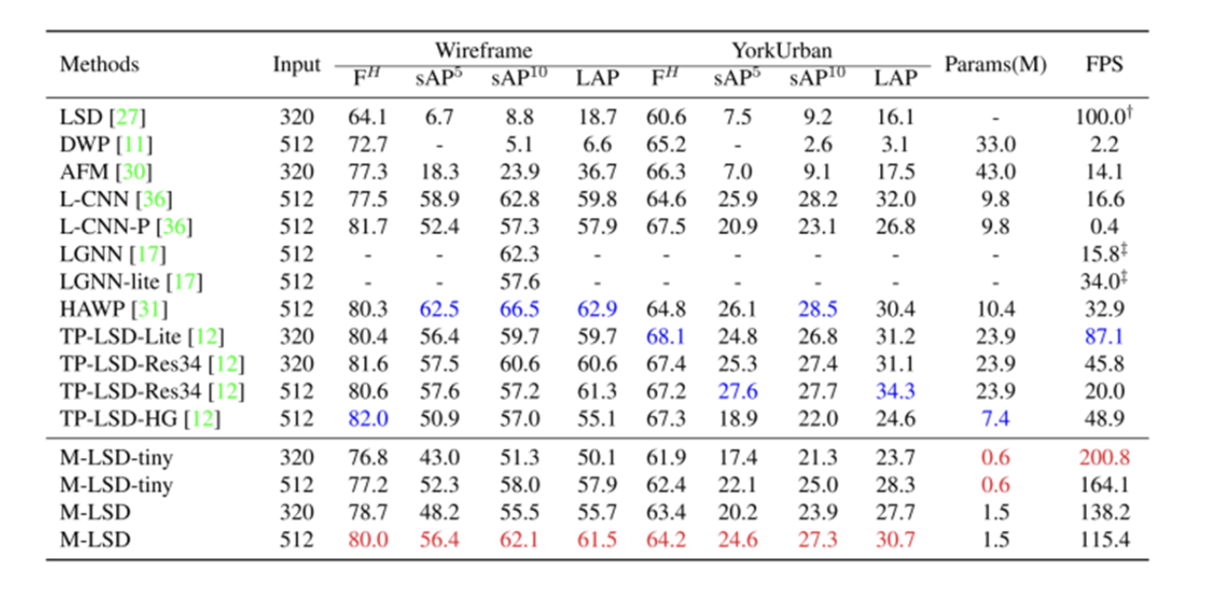 M-LSD와 M-LSD tiny 버전 metric을 보면 다른 LSD모델들에 비해 향상된 수치를 보여주는 것을 확인 할 수 있다.