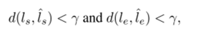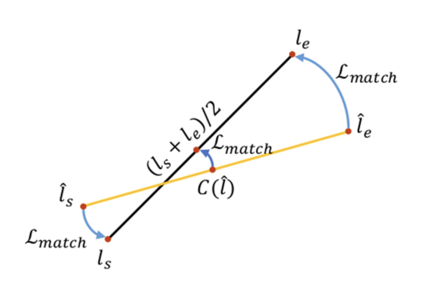 2. 다음으로, 1번에서 계산한 거리는 threshold 값인 γ(감마) 아래의 Ground Truth 선분 l과 예측된 선분 l^ 을 일치시키는 데 사용된다.