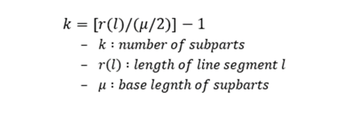 여기서 r(l)은 선분 l의 길이를 나타내고, µ는 subparts의 base length(기준 길이)를 나타낸다.