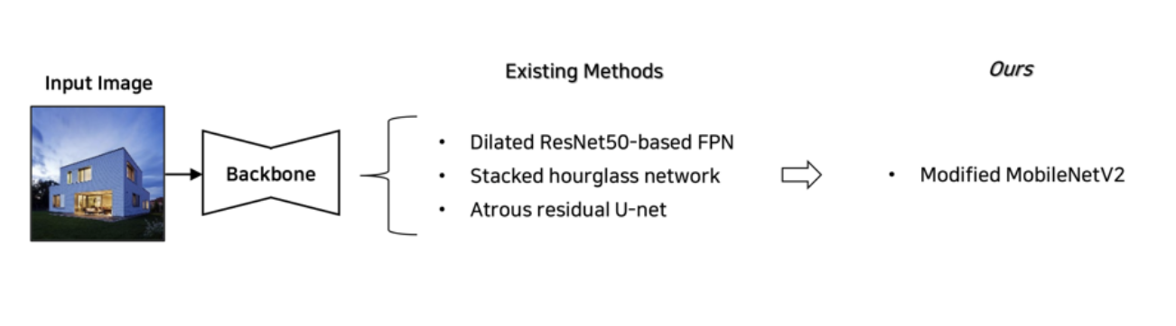 이전까지의 방법은 확장된 ResNet50 기반 FPN, hourglass 네트워크 및 Atrous residual U-net과 같은 대용량 백본 네트워크를 활용하기 때문에 큰 메모리와 높은 계산 성능이 필요할 수 밖에 없었다.