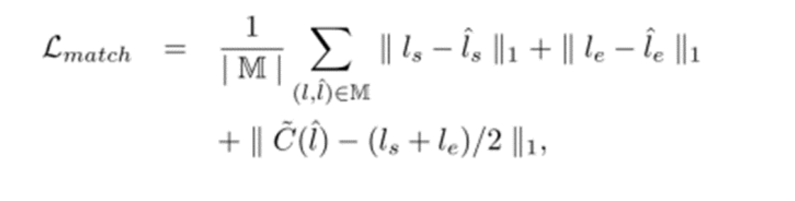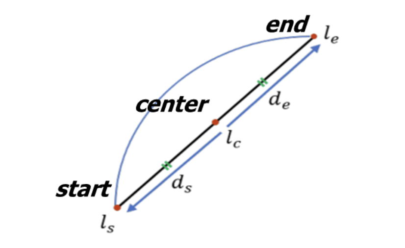 이는 다음과 같이 start, end 및 center point에서 일치된 선분의 기하학적 거리를 최소화하는 것을 목표로 한다.