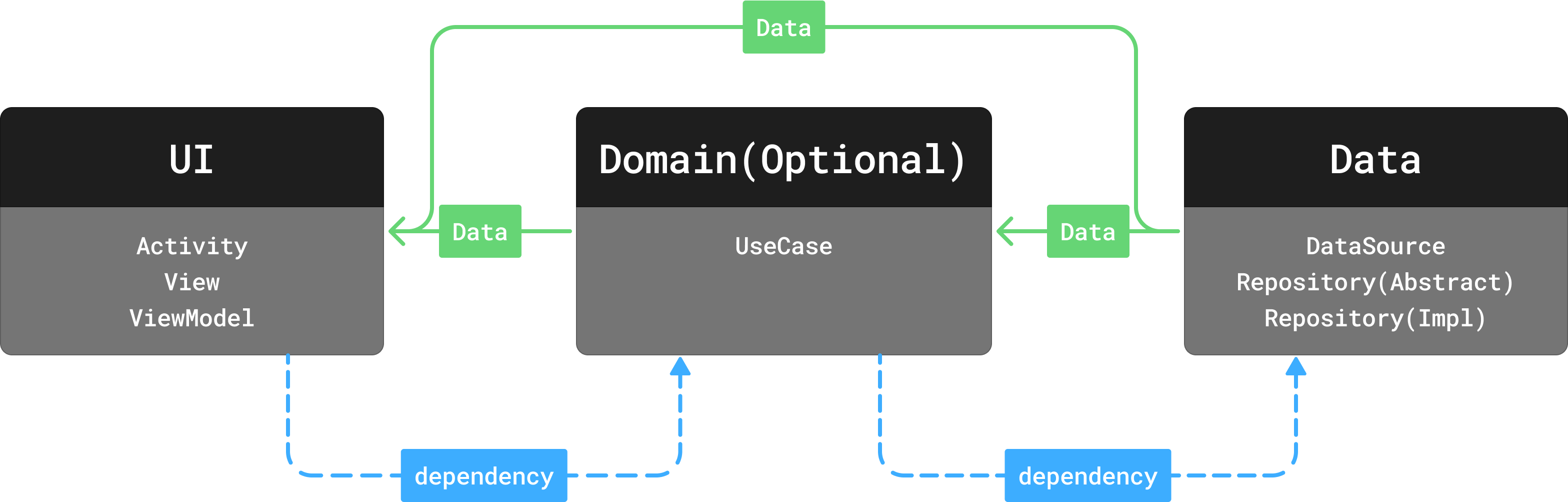 먼저 Domain은 옵션이기 때문에 Repository가 Data 레이어의 관할이 되면서 의존성의 방향이 달라졌다. 그리고 데이터의 흐름이 보다 자유분방해진 것을 볼 수 있다. Domain이 클린 아키텍쳐에서처럼 필수적인 것이 아닌만큼, 안드로이드 팀에서 Domain 레이어를 어떻게 사용하는가를 설계하는 팀과 개발자에 맡겼기 때문이다.