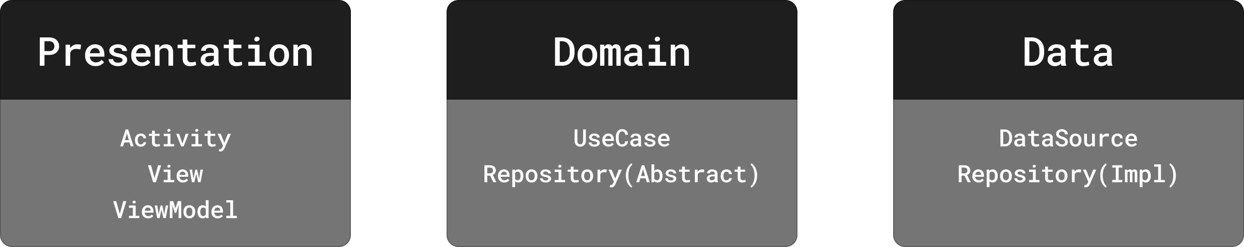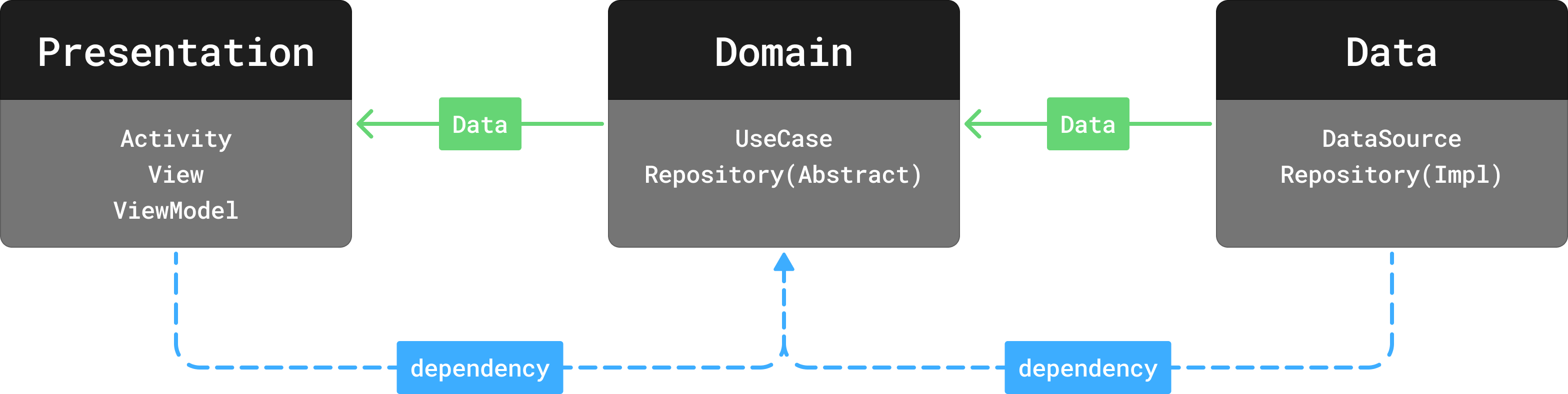 클린 아키텍쳐는 프로젝트 구조를 크게 세 레이어로 나눈다. UI를 담당하는 Presentation, 비즈니스 로직을 담당하는 Domain, 마지막으로 데이터를 다루는 Data.