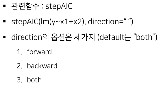 단계적방법(stepwise selection): 모든 변수가포함된모형에서 출발하여 기준 통계 값에 가장 도움이 되지 않는 변수를 삭제하거나, 모형에서 빠져 있는 변수 중에서 기준 통계치를 가장 개선시기는 변수를 추가함