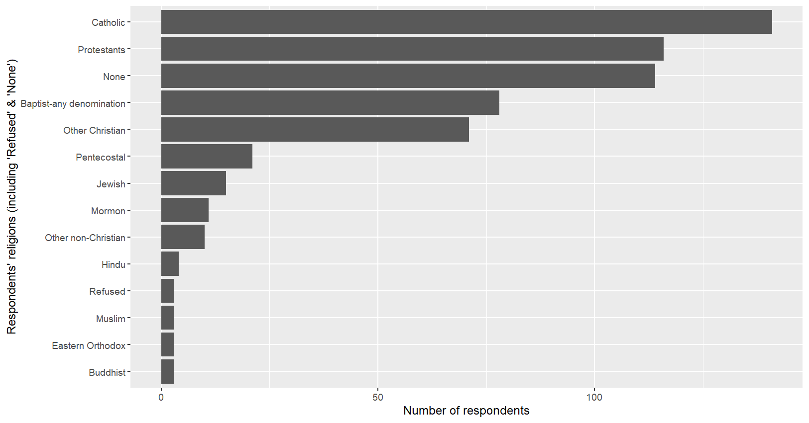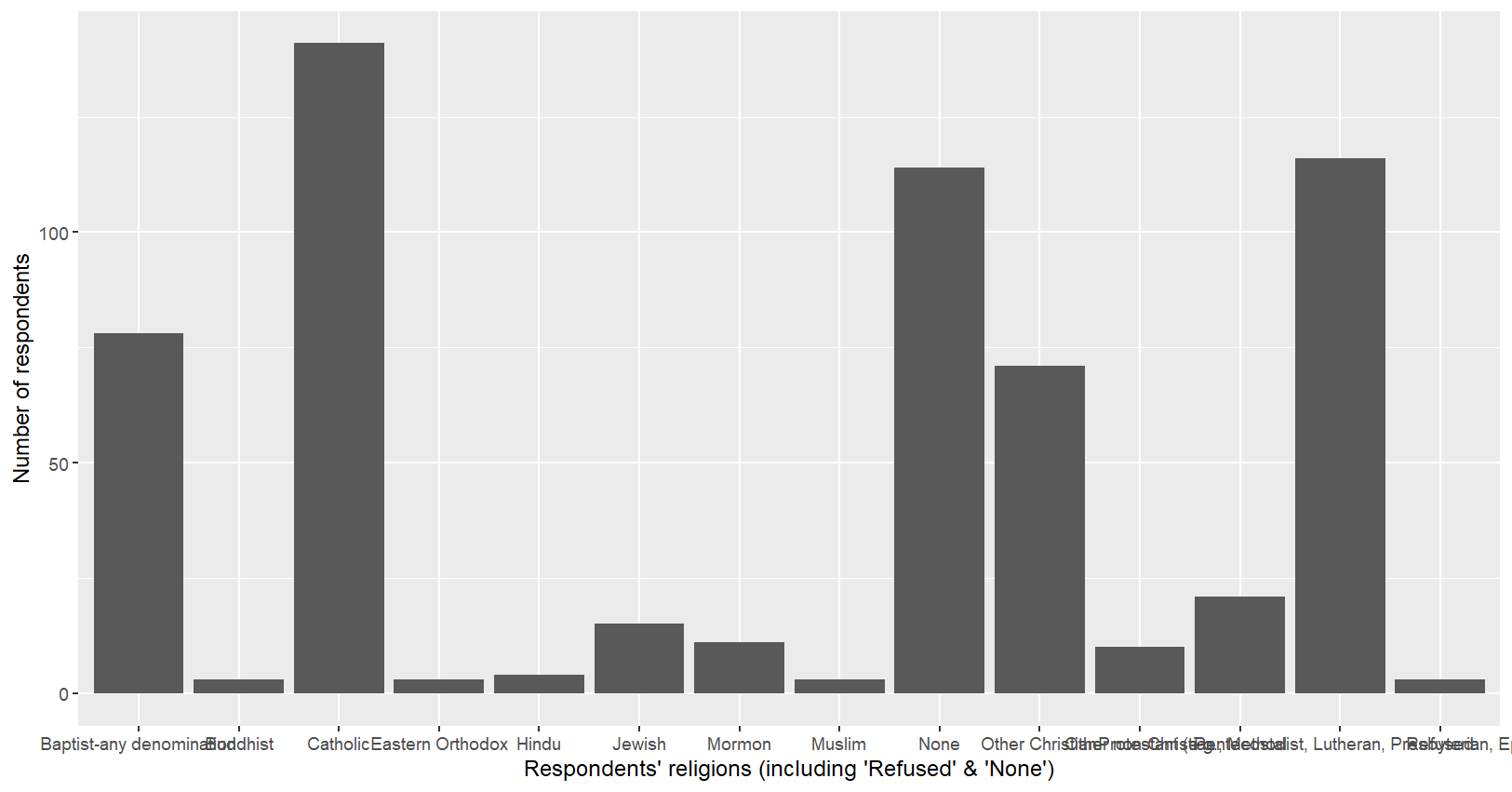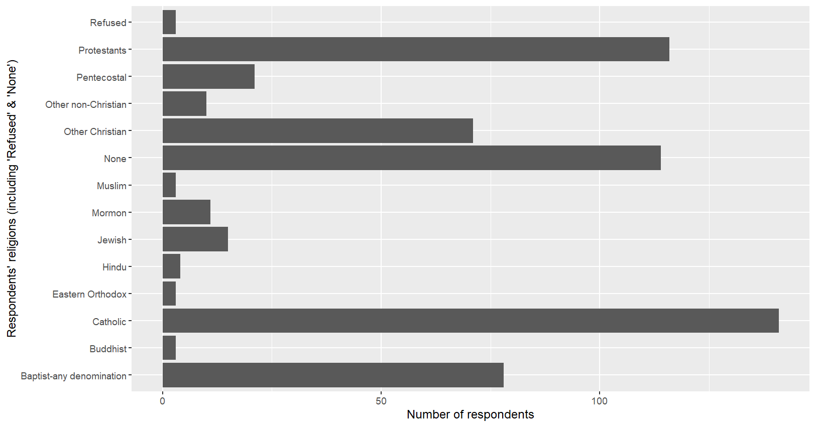 labs(x="Respondents' religions (including 'Refused' & 'None')",