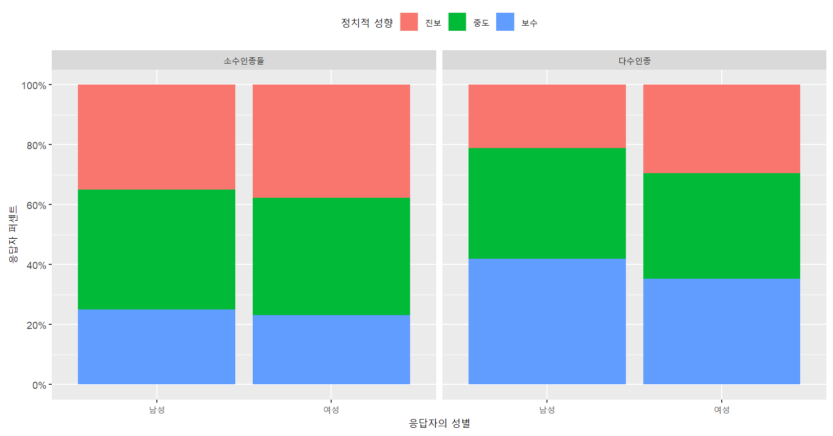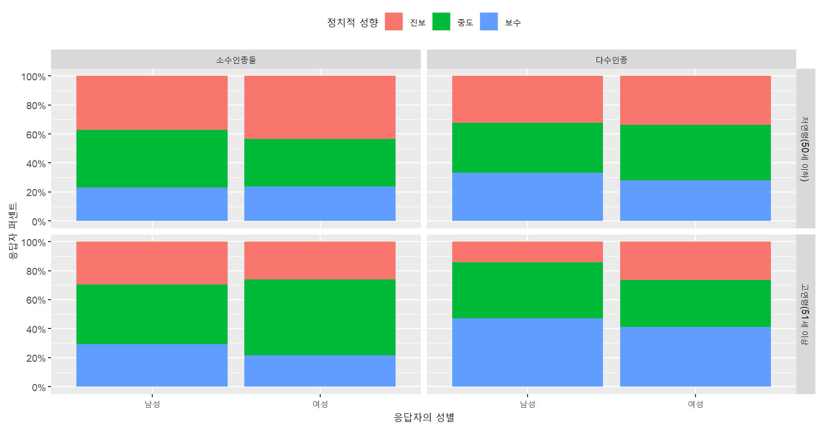 # 정치적 성향별 응답자를 쌓아두는 방식이 아니라 병렬시키는 방식