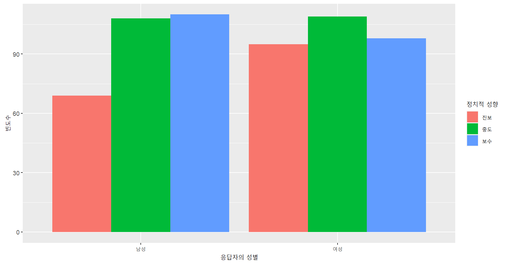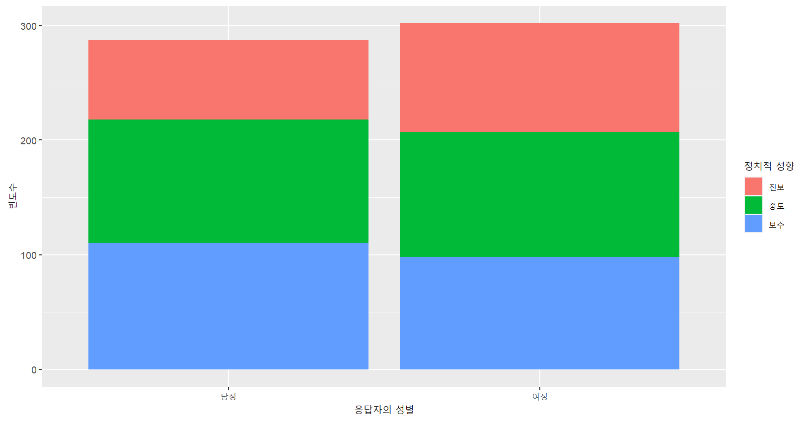 labs(x="응답자의 성별",y="빈도수",fill="정치적 성향")