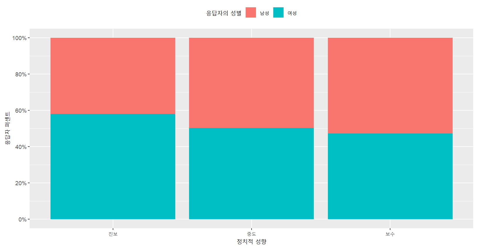 labs(x="응답자의 성별",y="응답자 퍼센트",fill="정치적 성향")+