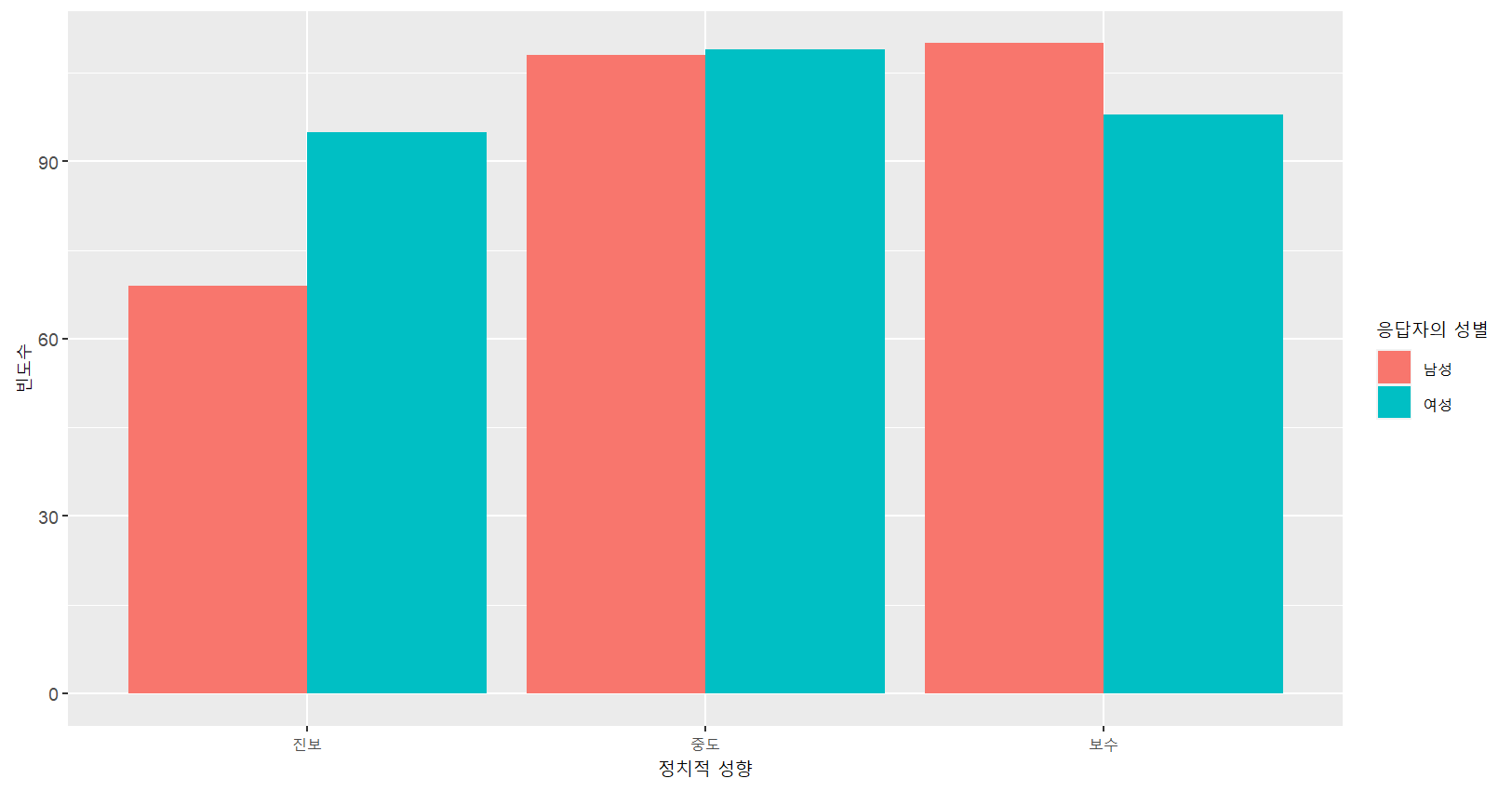 labs(x="정치적 성향",y="빈도수",fill="응답자의 성별")