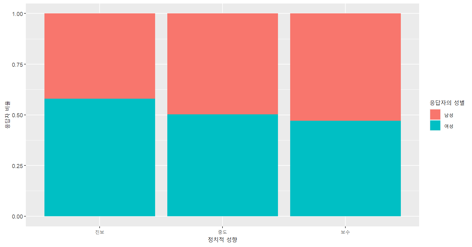 labs(x="정치적 성향",y="응답자 비율",fill="응답자의 성별")