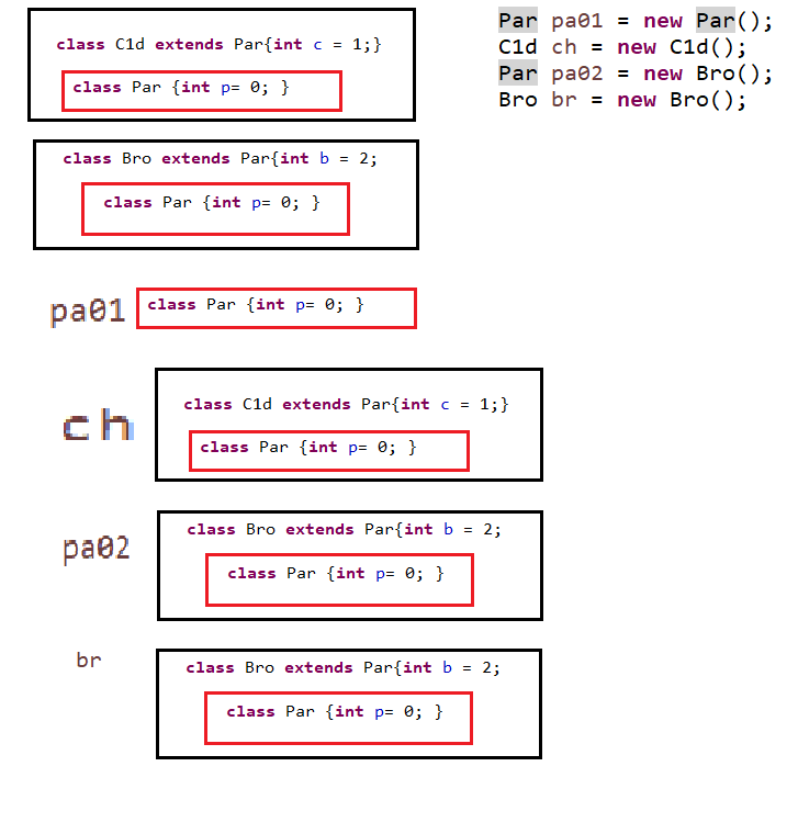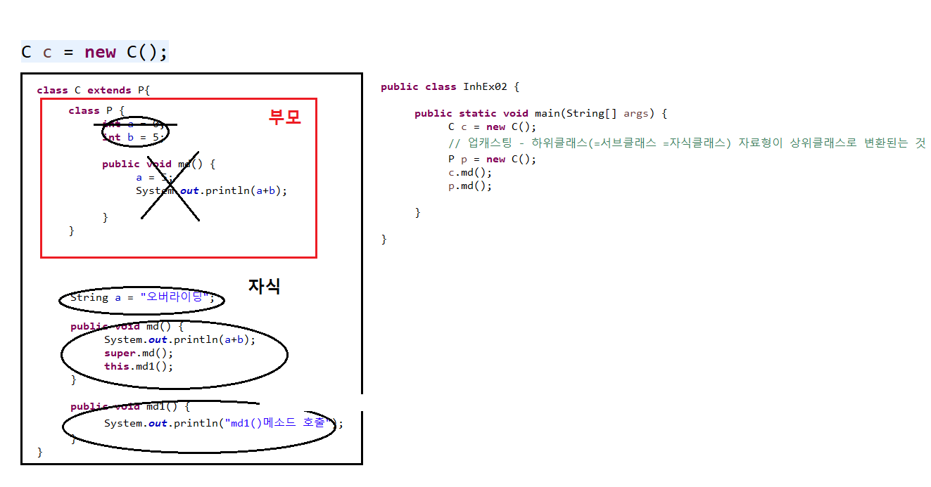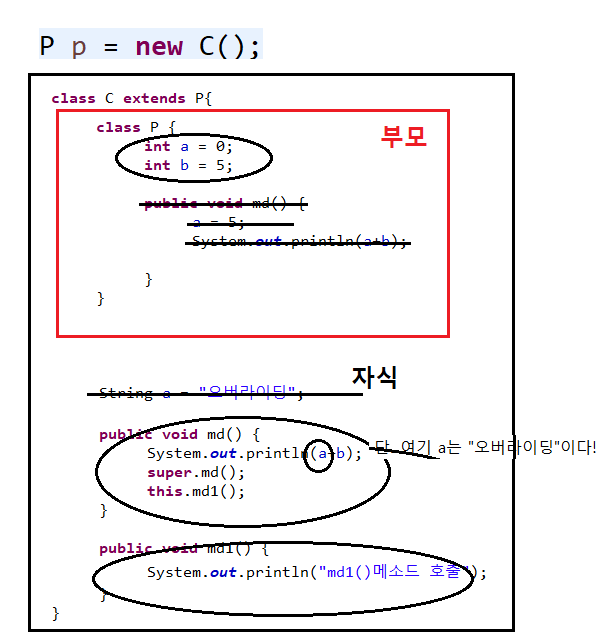 Pa p = new Cha(); // 성립 ---> 자료형 2개 가지고 있음. 다형성임.// 속성은 부모, 메소드는 자식