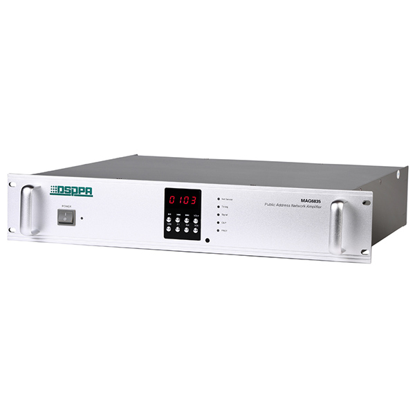 MAG68 series network controlled audio amplifier is a kind of fully networking digital analog-digital signal processor supporting 100/10Mbps self-adaptation TCP/IP network transmission protocol; with the design of double network backup, it is allowed to access to any switch simultaneously. Furthermore, this machine has the functions of network line fault detection and automatic selection in order to improve the reliability. The remote audio data stream is able to output the audio signal with this machine, and the host is subject to the intelligent control; in this machine, there is a built-in MP3 player with USB interface and SDC card port, so as to play MP3 program on this machine without playing the internet audio signal; there is a channel of auxiliary audio input interface used for connection of other audio source equipments (e.g. DVD machine); there is a channel of auxiliary audio output interface used for connection of other power amplifiers and extension of the power. There is also a channel of microphone interface used for local paging and so on.