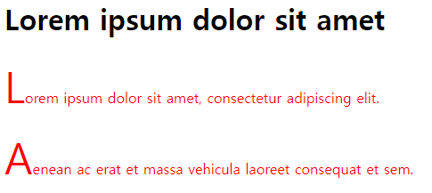 | 문자 선택자 | ::first-letter | p::first-letter |