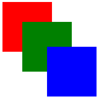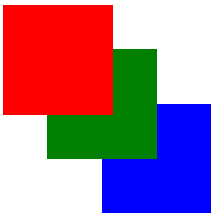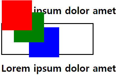 모두 같은 위치에 배치되어 마지막인 blue만 보인다.