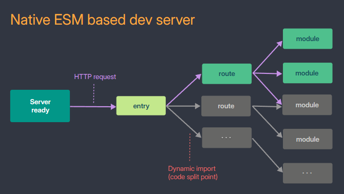 소스 파일을 변경하지 않고 그대로 브라우저로 전달하며 브라우저는 이 파일들을 Native ESM 방식으로 직접 가져와 실행한다.