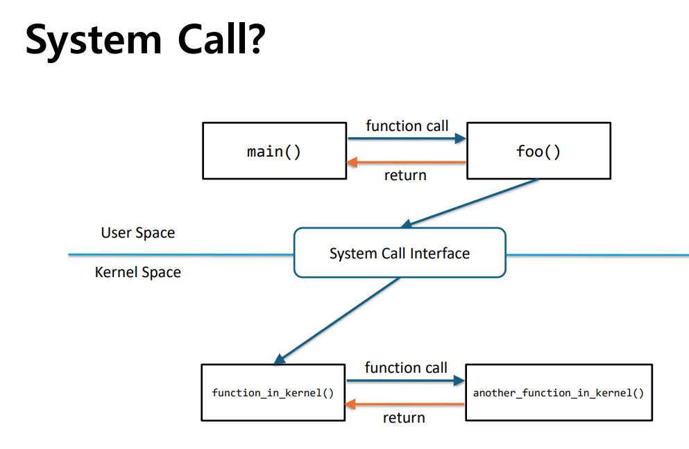 위 그림은 시스템 콜(System Call)의 작동 방식을 설명하는 다이어그램입니다. 사용자 공간(User Space)과 커널 공간(Kernel Space)을 구분하는 선이 보이며, 이 두 공간 사이에는 시스템 콜 인터페이스(System Call Interface)가 있습니다.