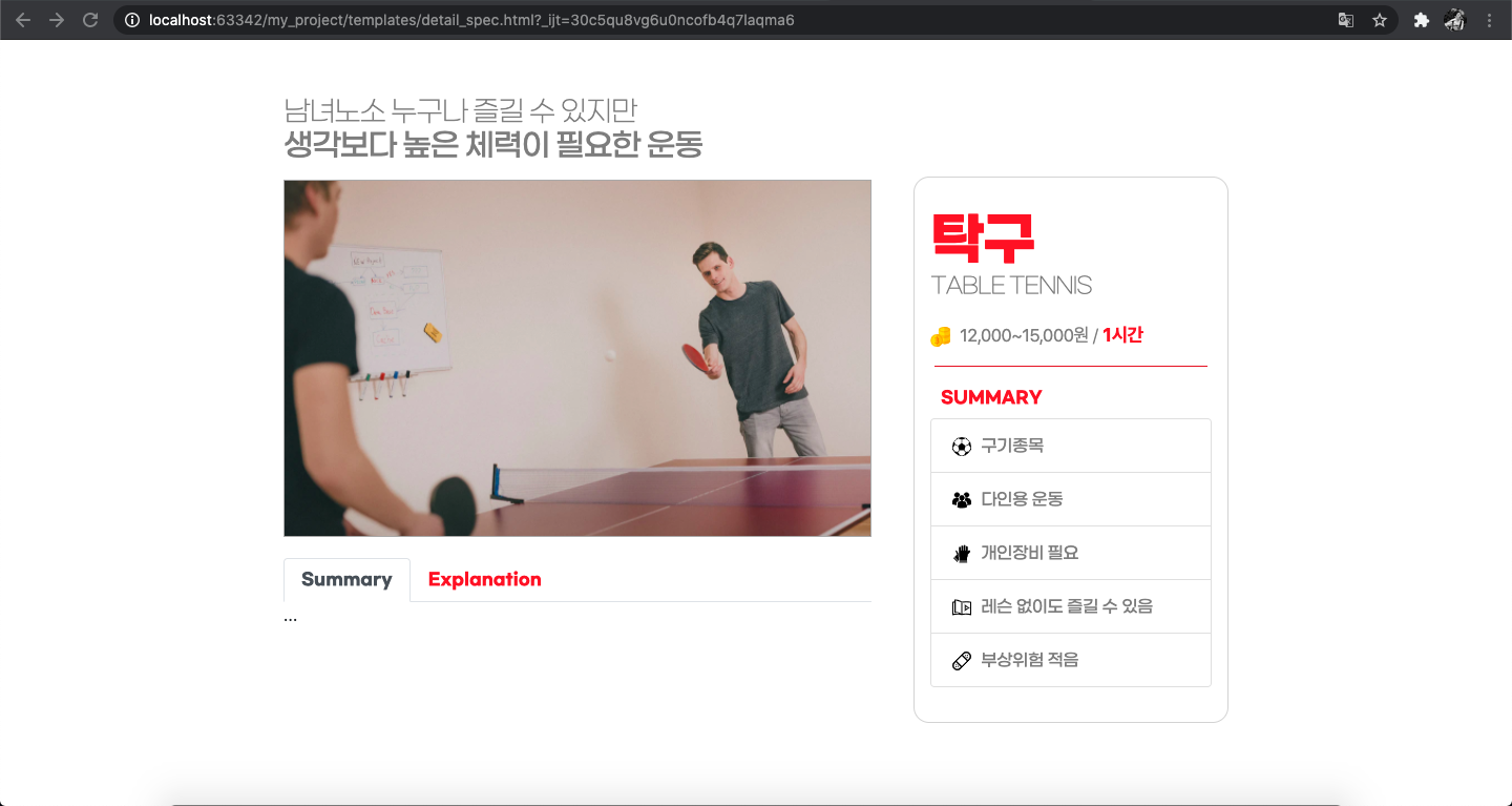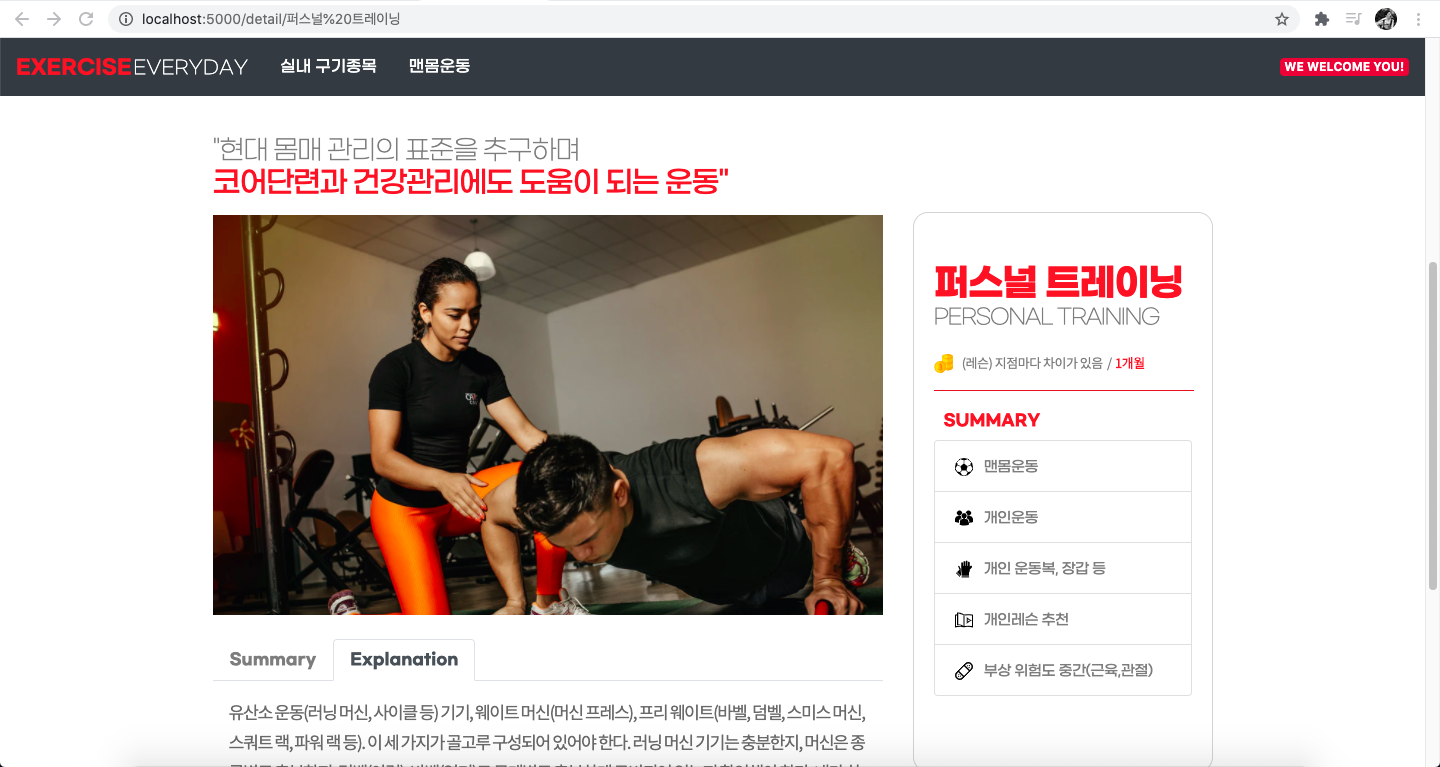 상단에 운동에 대한 짧은 코멘트를 재빠르게 지어내었고 오른쪽에는 간략하게 축약하여 특징을 설명하고자 하였다. 오른쪽 바의 summary 하단의 5줄의 bar는 역시나 부트스트랩을 가져왔다.