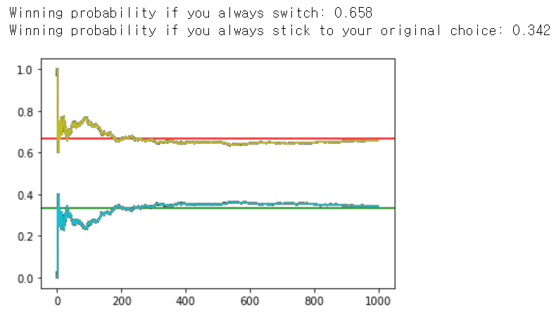 print('Winning probability if you always stick to your original choice:', stick_win_probability[-1])