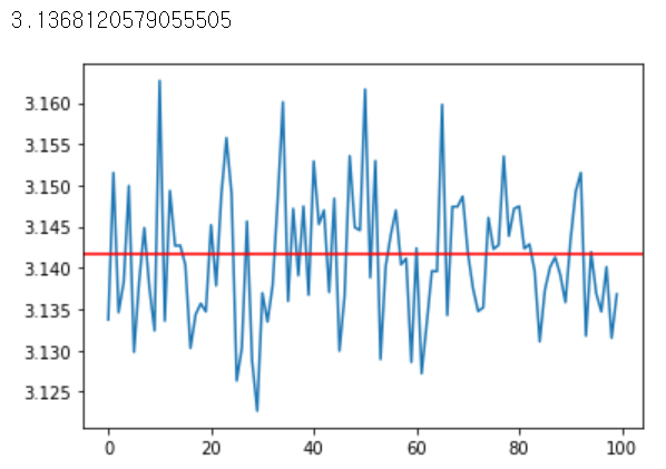 plt.axhline(y=math.pi, color='r', linestyle='-')