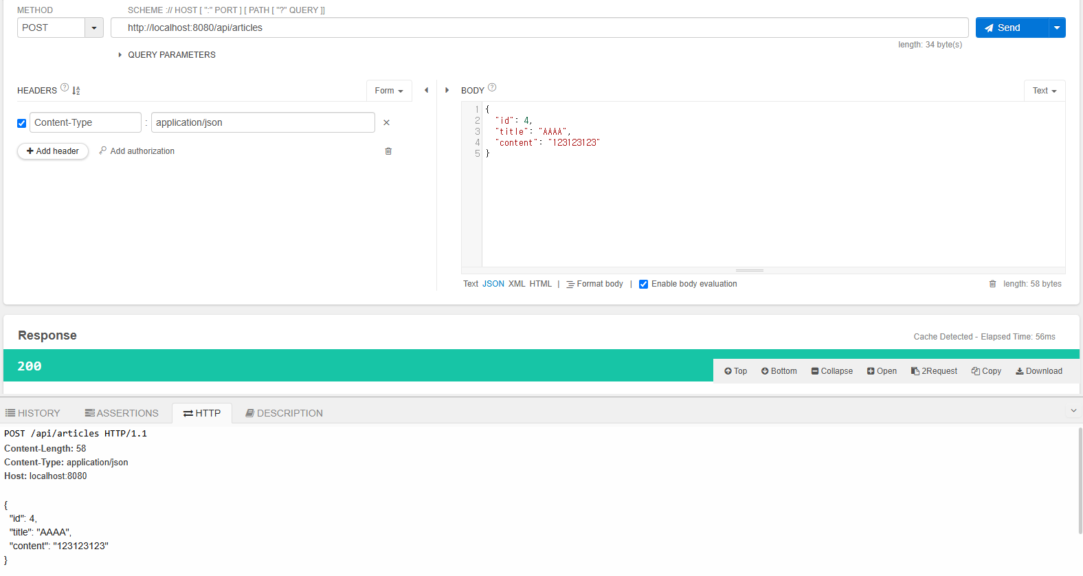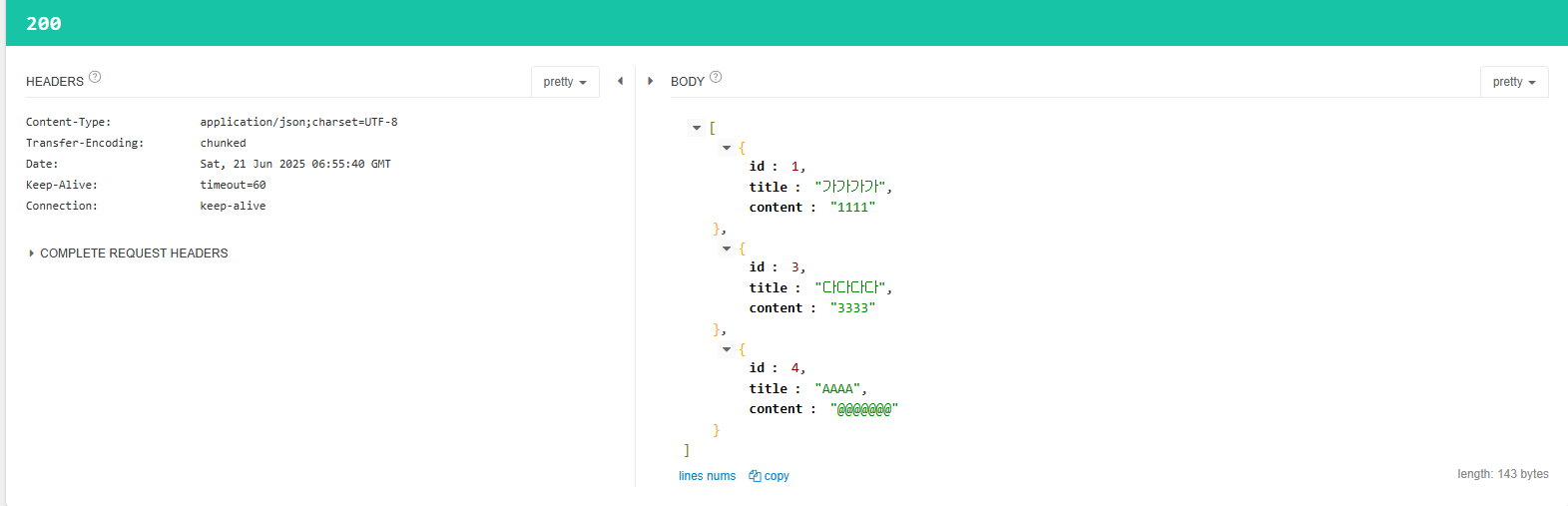 코드 작성 후, 서버를 재시작하고 POST 요청을 보내보면 성공 응답이 돌아오며, GET요청으로 추가가 되었음을 확인할 수 있다.