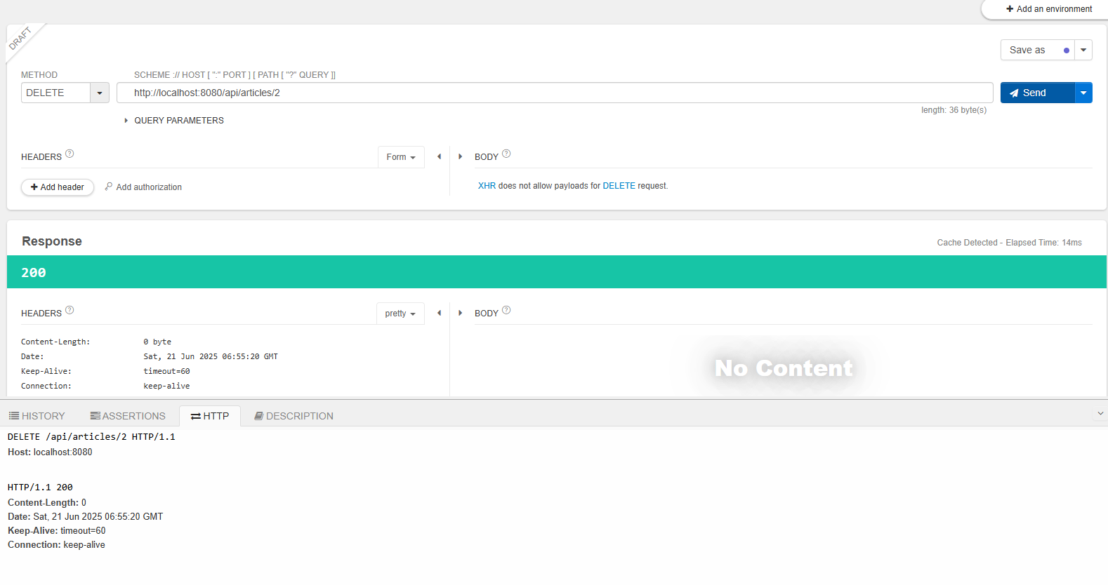 이제 DELETE 요청을 보내서 삭제가 잘 되는지 확인해본다.