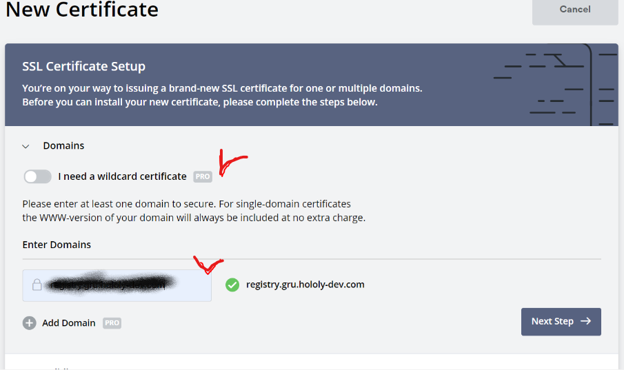 Next, enter the domain you want to issue ssl to. In this case, do not select wild cards. (Wild Card is a paid plan)