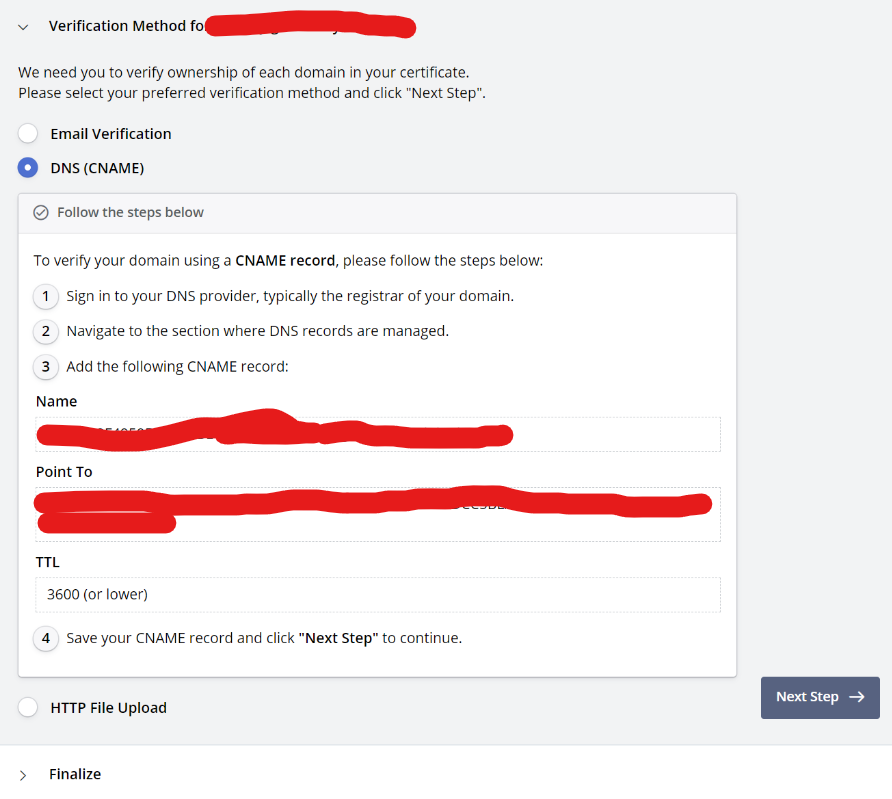 Verify by adding CNAME record given by zerossl to DNS