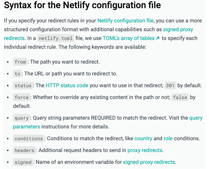 I tried to deploy by creating a toml file with only redirects settings and putting it in the root folder (not the distribution location).