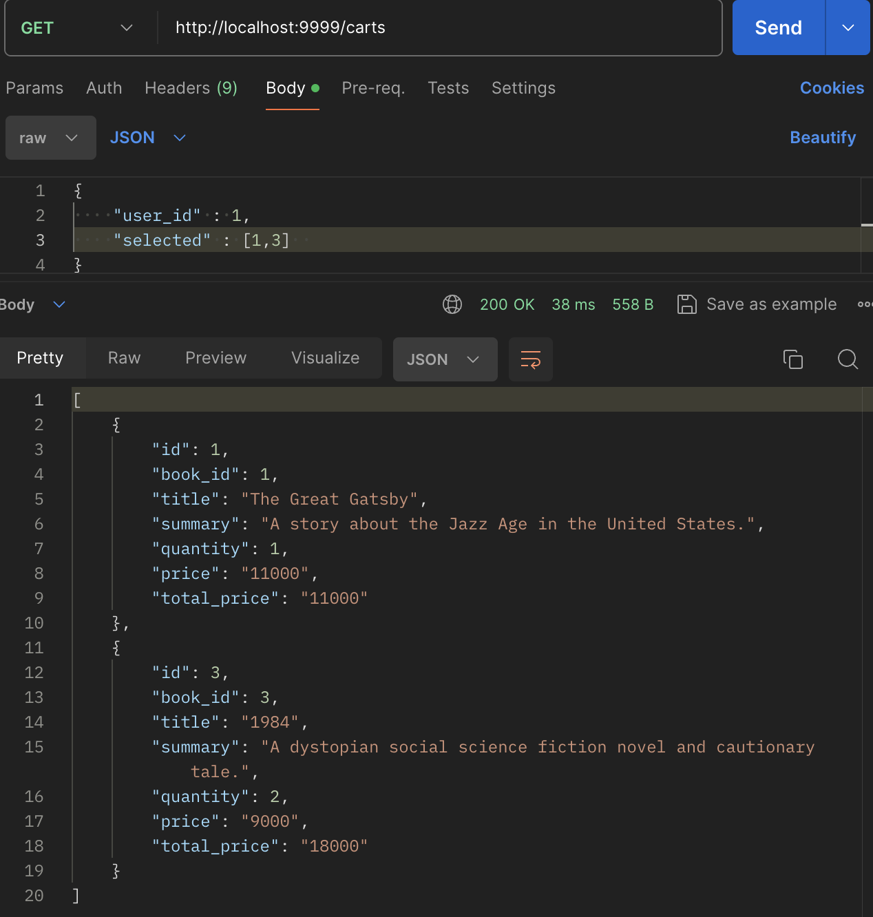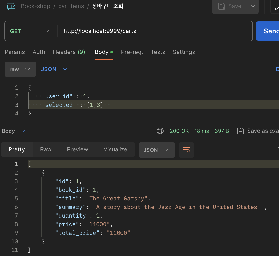 보다시피 body로 2개를 받는데 유저의 아이디와 선택한 아이템들에 관한 아이디 값을 받는다.