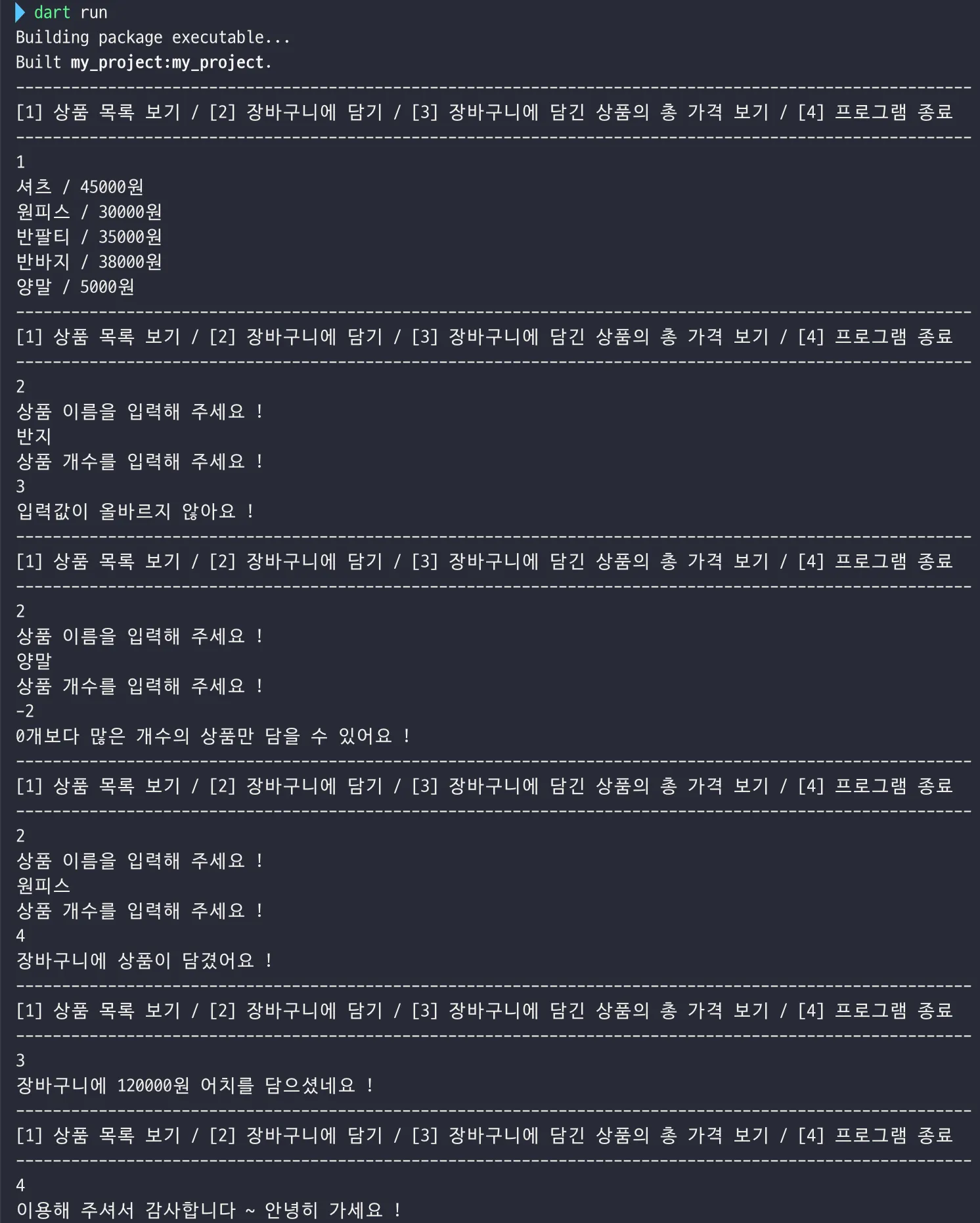 dart run bin/shopping_mall.dart💭 이렇게 run을 돌리면 실행되어 값이 나온다고 한다.