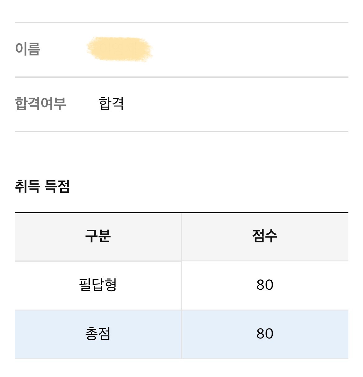 시험장을 나와서 수제비 카페 회원님들과 답을 맞춰보며 가채점을 해 봤는데 가채점으로 총 80점이 나왔습니다! 애매한 문제들 제외해봐도 합격권이라 일단은 한시름 놓을 수 있었습니다😅