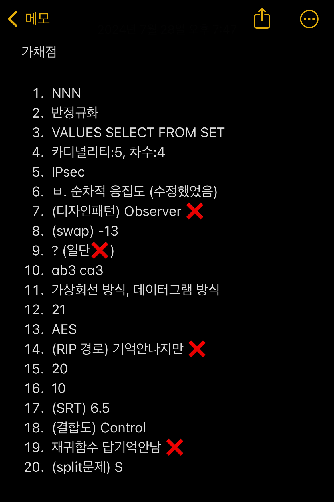 시험 전날~당일에는 거의 오답정리 노트만 보면서 외웠고 마지막으로 기출 문제 1회차를 풀고 시험장에 들어갔어요.