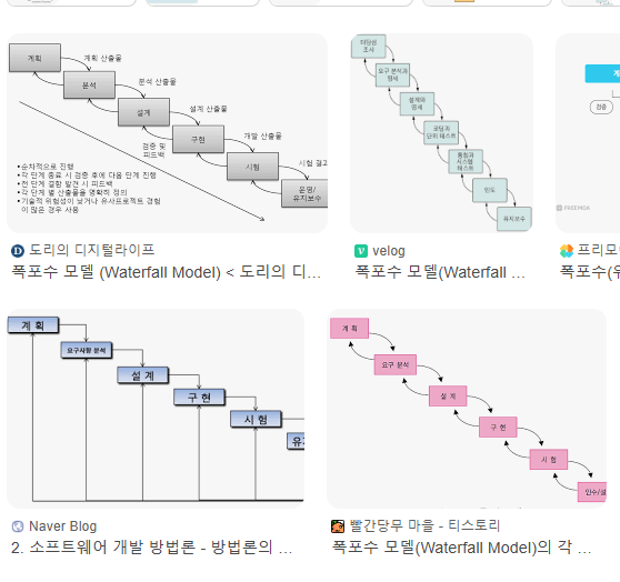 - SDLC의 고전적인 접근 방식으로, 단계가 순차적으로 진행된다. 각 단계는 명확하게 구분되며, 이전 단계가 완료된 후에만 다음 단계로 진행한다.