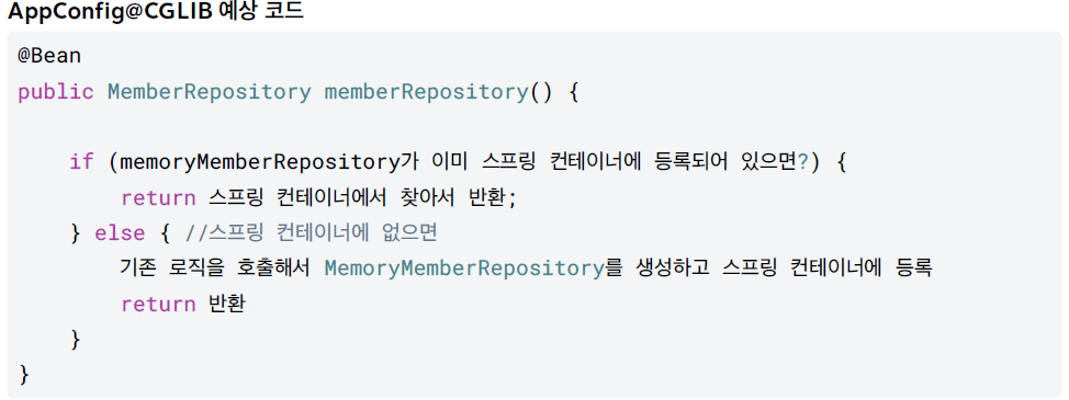 우선 Configuration에 등록 된 빈은 스프링 CGLIB라는 바이트코드 조작 라이브러리를 사용하여 ConfigurationTest 클래스를 상속받은 임의의 다른 클래스를 만들고, 그 다른 클래스를 스프링 빈으로 등록 한 것이다.