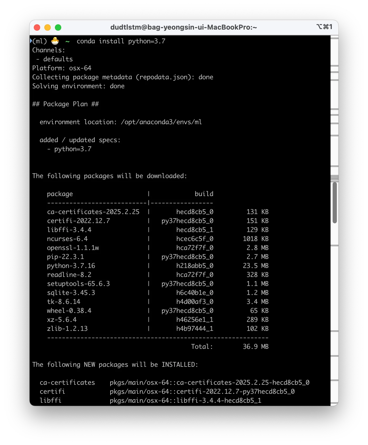 아래 방법을 수행하면 MacOS에서도 python 3.7 환경을 정상적으로 만들 수 있다.