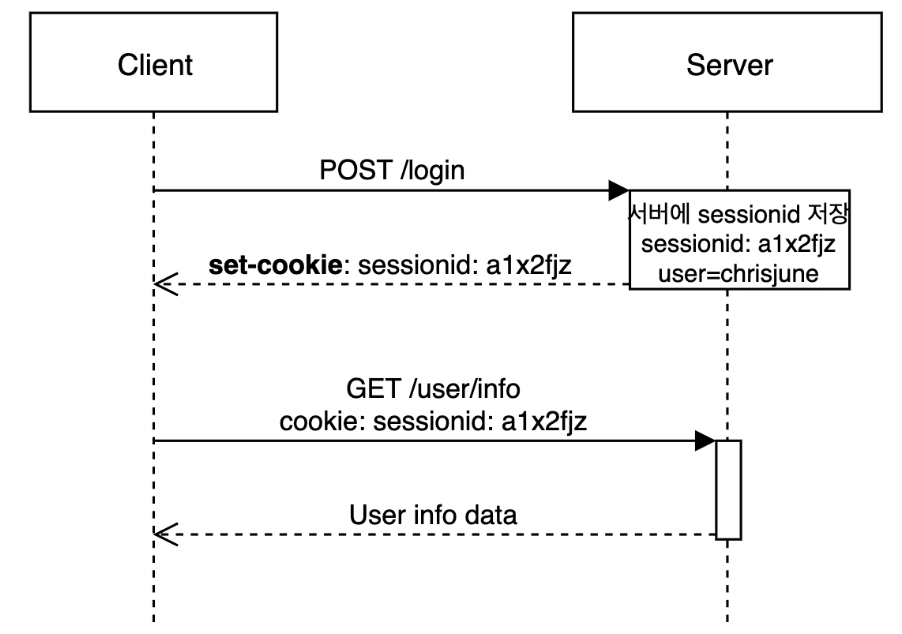 5. 서버에서는 요청 헤더의 세션 ID값을 저장된 세션 저장소에서 찾아보고 유효한지 확인 후 요청을 처리하고 응답한다.